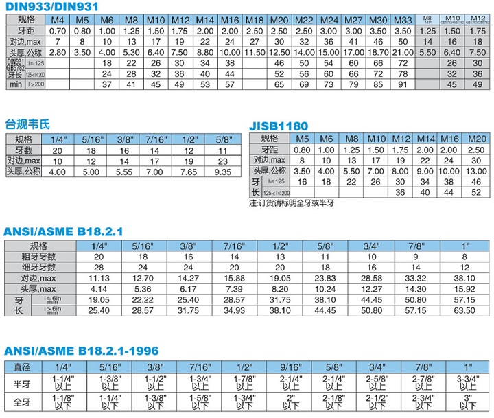 標準:DIN933、DIN931、GB5783、GB5782、14P、ANSI B18.2.1、JISB1180、臺規(guī)韋氏